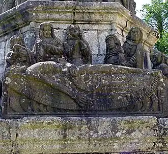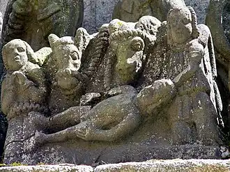 The Notre-Dame church at Kergrist-Moëlou dates back to the early 16th Century and was built by the brothers Guillaume and Pierre Jézéquel. The calvary dates to 1578 and the sculptural work involved is attributed to Guillaume Jézéquel. It was commissioned by the Baron de Pont-l'Abbé to celebrate the recovery of his daughter who was dying but recovered after he had made a pilgrimage to Kergrist to pray for help. In style the calvary is thought to have been inspired by that at Plougonven. It stands in the churchyard and there is an inscription on the west face reading "EN L AN 1578 G. JEZEQUEL." It was restored in the 19th Century but the original order in which the pieces had been arranged was not kept to. The 1922 restoration was carried out after the calvary was declared a "Monument Historique" in 1921, becoming the only calvary in Côtes d'Armor to be given such protection.[1] and another restoration was carried out in 1960. In the Breton language "Kergrist" means the "village of Christ". Several of the statues that survived the 1793 attack are arranged on the upper surface of the pedestal and the others stand on a ledge which runs around the pedestal's lower part.[2][3][4]