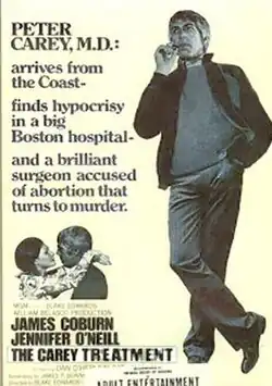 The Carey Treatment is a 1972 American crime thriller film directed by Blake Edwards and starring James Coburn, Jennifer O'Neill, Dan O'Herlihy and Pat Hingle. The film was based on the 1968 novel A Case of Need credited to Jeffery Hudson, a pseudonym for Michael Crichton. Like Darling Lili and Wild Rovers before this, The Carey Treatment was heavily edited without help from Edwards by the studio into a running time of one hour and 41 minutes. These edits were satirized in his 1981 black comedy S.O.B.[1][2]