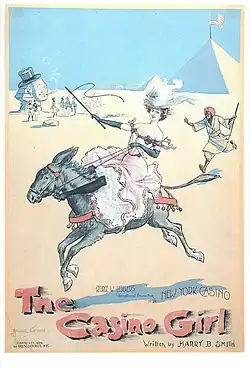 The Casino Girl was billed as the twin sister of The Belle of New York[3] and was commissioned for the Casino Theatre in New York as a vehicle for Mabelle Gilman with a cast that included Virginia Earle in a breeches role as Percy, Adele Ritchie,[4] Lotta Faust[5] and Sam Bernard as Pilsener. It ran at the Casino from 19 March 1900 to 9 June 1900 for a run of 51 performances and was revived at the same theatre on 6 August 1900 for 40 performances before going on a tour of the United States.[6] It was produced by George Lederer, with music by Ludwig Engländer, Will Marion Cook, Will Accooe, Harry Truman MacConnell and Arthur Nevin, lyrics by Engländer, Cook and MacConnell, and a book by Harry B. Smith[7] and Arthur Nevin.[6][8] The show had a revival at the Knickerbocker Theatre in New York from 8 April 1901 starring Katie Seymour and James E. Sullivan.[2]