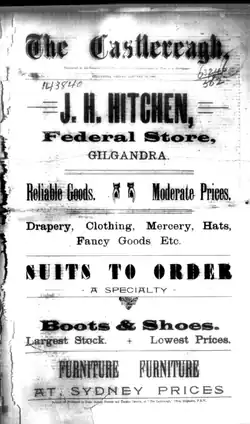 The Back to Gilgandra – Souvenir Booklet[2] states that The Castlereagh was produced as a four-page weekly, but the first issue of the newspaper was 12 pages long. The last digitised issue of the paper which is available via Trove, is Vol. 3 – No. 51, and was published on Friday, 20 December 1907. It was 17 pages long and included a four-page Christmas supplement. By this stage, the masthead bore the subtitle "Circulating throughout Gilgandra, Curban, Collie, Gular, Armatree, Tooraweenah, Balladoran & Mundooran Districts".[1]