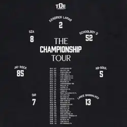 The Championship Tour[2] was a co-headlining concert tour by the independent record label Top Dawg Entertainment. The tour featured artists Kendrick Lamar, SZA, ScHoolboy Q, Jay Rock, Ab-Soul, Sir, and Lance Skiiiwalker. The tour began in Vancouver on May 4, 2018, and concluded in Burgettstown on June 16, 2018.