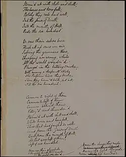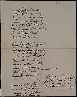 The poem was written after the Light Cavalry Brigade suffered great casualties in the Battle of Balaclava. Tennyson wrote the poem based on two articles published in The Times: the first, published on 13 November 1854, contained the sentence "The British soldier will do his duty, even to certain death, and is not paralyzed by the feeling that he is the victim of some hideous blunder," the last three words of which provided the inspiration for his phrase "Some one had blunder'd."[3] The poem was written in a few minutes on 2 December of the same year, based on a recollection of The Times's account;[4] Tennyson wrote other similar poems, like "Riflemen Form!", in a very similar manner.[5]