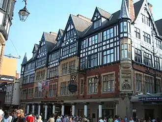 The upper façade of the building is distinctive half-timbered black-and-white, in the Tudor Revival style that is typical of Chester architecture. As a hotel, it is recognised as offering five-star, luxury accommodation and service.[7] The hotel has 68 guest bedrooms and 12 suites, a fitness centre, a spa, a lounge and bar, boardrooms, a Parisian style family restaurant La Brasserie and a highly acclaimed restaurant, Simon Radley at the Chester Grosvenor.[8] Formerly known as The Arkle, the name of the restaurant changed in 2008 to reflect the success and expertise of its head chef, Simon Radley, who first joined the hotel in 1986.[9] In 2013, the restaurant was awarded its 24th consecutive Michelin star.[10] One of only four restaurants in the UK to have retained a star for that length of time, it is also the only restaurant in the north of England to have done so.[11] Simon Radley at the Chester Grosvenor, formerly known as The Arkle, until 2022, it had previously retained its Michelin star for 30 consecutive years.[12]
