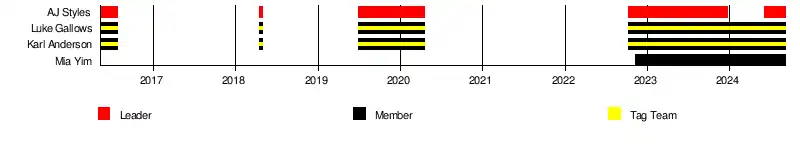 Previously working in New Japan Pro-Wrestling as members of Bullet Club, the trio of Styles, Gallows and Anderson reunited in WWE in May 2016 as The Club, before splitting two months later. They would officially reunite in July 2019, having adopted The O.C. as their new name. The team split again in April 2020 when Gallows and Anderson were released from WWE but reformed upon their return to the company in October 2022 with Mia Yim joining the group the next month. As of September 2024, the stable has quietly disbanded.
