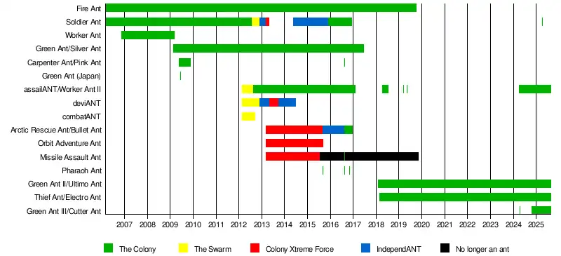 Debut | Fire Ant and Soldier Ant: February 25, 2006[1][2] Worker Ant: November 17, 2006[3] Silver Ant: February 20, 2009[4] Carpenter Ant: May 24, 2009[5] Worker Ant (II): August 1, 2009[12] |