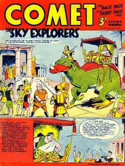 After the end of World War II, Sale, Greater Manchester publisher J.B. Allen opted to take advantage of the conflict's impact on story papers and comics. Paper rationing had seen many established pre-war titles fold or merge with other publications, while children's literature had naturally been low priority as cargo on Atlantic convoys, ending importation of American comic books. As such, there were gaps in the post-war market.[1] Launched on 20 September 1946, The Comet was the first new British comic launched since before the war, and consisted of eight 9.5 inch by 12.25 inch pages, some enhancing the black-and-white with red ink, and was priced at 2d. The fortnightly paper was a mix of picture strips (initially adventure story "Round the World in the Flying Fish" and literary adaptation "Treasure Island"), illustrated prose stories and comedic cartoons.[2]