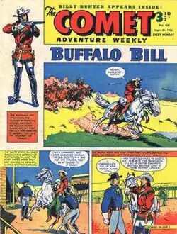 In May 1949, the large London-based Amalgamated Press bought out J.B. Allen. The new owners assigned two of their most successful editors, Edward Holmes and Leonard Matthews, to revamp The Comet and Sun respectively into weekly comics. Before the war, Holmes had been the driving force in setting up AP's Dandy/Beano competitor Knockout. Following wartime service, Holmes - a strong advocate of picture strips as the future of comics - had been assigned to develop a line of American-style comic books for AP's division in Australia and New Zealand. He experienced particular success with Western characters Kit Carson (based on the real-life frontiersman) and Buck Jones (based on a fictionalised version of the film star),[3] while also instigating the creation of early British superhero Thunderbolt Jaxon.[4] Based on this experience, Holmes decided to reinvent The Comet as a through-and-through boys' adventure title, phasing out the humour cartoons, though briefly featuring the female-led "June" - a young, innocent but equally disaster-prone version of Norman Pett's newspaper pin-up icon Jane. Buck Jones and Thunderbolt Jaxon were chosen to spearhead the newly rebranded Comet Comic, initially using the extant art.[3] The comic also emphasised its link with Sun - both titles were marketed as companions under the "Happy Comics" banner, and frequently advertised each other.[2]