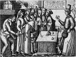 Bosch depicts how people are fooled by lack of alertness and insight, creating a "spellbinding tension" that reappears in his later paintings.[1] The conjurer on the right of the image captures his apt and diverse audience with a game of cups and balls. The central character and true focus of the image is the man of rank in the forefront who leans in and is fixed on the pearl in the conjurer's hand while unaware of being relieved of his money purse. Bosch depicts the conjurer as a common criminal, luring in the prey.[6][7]