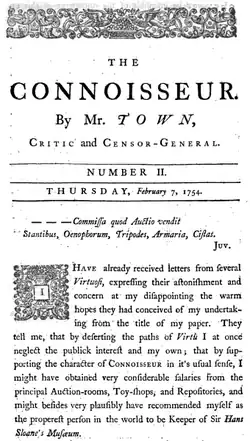 The Connoisseur (by Mr. Town [pseud.], Critic, and Censor-General. 2 vols. 140 nos. (31 January 1754 – 30 September 1756), was a London weekly eighteenth century newspaper founded and chiefly run by George Colman the Elder and the parodist Bonnell Thornton as a 'plebeian' counterpart to Edward Moore's The World, a periodical of about the same time, which dealt more with the interests of aristocrats.[1] James Boswell says in his Life of Johnson: