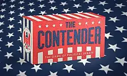 The Contender: The Game of Presidential Debate is a United States presidential election debate-themed party game using cards. The objective of the game is to use Argument Cards to win a mock presidential debate between other potential candidates. Players take turns debating an issue drawn from a deck of Topic Cards using phrases from the Argument Cards, creating the most convincing or entertaining argument. The game's development originated from a successful Kickstarter campaign, receiving acclaim for its simple concept backed up by its satirical, mature content.