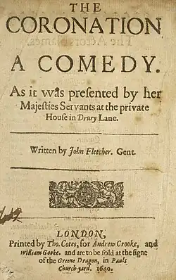 The play was licensed by the Master of the Revels on 6 February 1635, and was probably written in the previous year or so. In May 1636, however, the London theatres shut down for one of their longest and most severe closures due to bubonic plague. Shirley left for his four years in Dublin (1636–40), and in the next year or so the playing company for which he had been serving as house dramatist, Queen Henrietta's Men, sold off their stock of Shirley's plays to the London booksellers. The result was that a group of Shirley's plays appeared in print in the late 1630s. Most of these were published under Shirley's name; only one, The Coronation, was misattributed to another dramatist. The first edition of The Coronation was issued in 1640 in a quarto printed by Thomas Cotes for the booksellers Andrew Crooke and William Cooke. And the authorship of the play was assigned to John Fletcher.