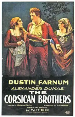 The Corsican Brothers is a 1920 American silent historical adventure film directed by Colin Campbell and starring Dustin Farnum, Winifred Kingston, and Wedgwood Nowell.[1] It is an adaptation of the novel The Corsican Brothers by Alexandre Dumas.