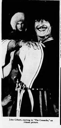 Among the many extras used in The Cossacks were members of a "Dijigit Troupe" of over 100 genuine Russian Cossacks, who in 1926 came to the United States from Europe after performing equestrian exhibitions and traditional Cossack musical and dance shows in various cities in France and England.[5][6] Once the troupe arrived in the United States, MGM contracted some of its horsemen to perform as trick riders and as doubles in several of the studio's films in 1927 and 1928, including The Gaucho and The Cossacks.[5] In its review of The Cossacks in June 1928, the American entertainment trade publication Variety notes the use of these Russian extras and their contributions to enhancing the authentic "look" of the film. Variety also comments on the equestrian exhibition, "the fiasco", that the Cossack troupe had presented in New York at Madison Square Garden before some of its performers continued to California, where MGM crews had constructed elaborate location sets for the Cossacks in Laurel Canyon:[6]