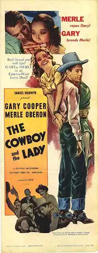 The Cowboy and the Lady is a 1938 American Western romantic comedy film directed by H.C. Potter, and starring Gary Cooper and Merle Oberon. Written by S.N. Behrman and Sonya Levien, based on a story by Frank R. Adams and veteran film director Leo McCarey, the film is about a beautiful socialite masquerading as a maid who becomes involved with an unpretentious, plain-spoken cowboy who is unaware of her true identity. The Cowboy and the Lady won an Academy Award for Sound Recording (Thomas T. Moulton), and was nominated for Original Score (Alfred Newman) and Original Song ("The Cowboy and the Lady" by Lionel Newman and Arthur Quenzer).[2][3]