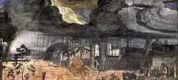 In the upper central area is a hail storm, sent by God to punish the Egyptians. Also depicted are some sunrays and, more to the left, a rainbow, symbols of the upcoming liberation for the Israelite people. Similar representation of meteorological phenomena were not uncommon in the 15th-century Italian art: other examples are Fra Angelico's Martyrdom of St. Mark on the Tabernacle of the Linaioli, and several Paolo Uccello's St. George and the Drake.