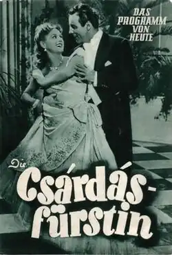 The Csardas Princess (German: Die Csardasfürstin) is a 1951 German musical film directed by Georg Jacoby and starring Marika Rökk, Johannes Heesters and Hubert Marischka.[1] It is based on the 1915 operetta The Csardas Princess and is part of the tradition of operetta films.