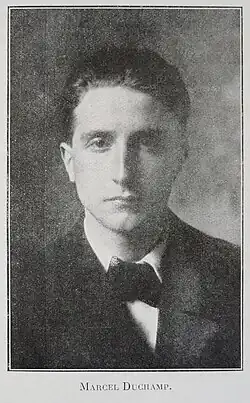 To date, Duchamp's production had been too spars and differed considerably from one painting to the next. Apollinaire hesitated to make any broad generalizations, noting rather Duchamp's apparent talent and his abandoning of "the cult of appearances". To free his art from all perceptions, Duchamp wrote the titles on the paintings themselves. "This literature, which so few painters have been able to avoid, disappears from his art, but not poetry. He uses forms and colors, not to render appearances, but to penetrate the essential nature of forms and formal colors... Perhaps it will be the task of an artist as detached from aesthetic preoccupations, and as intent on the energetic as Marcel Duchamp, to reconcile art and the people."[28][38]
