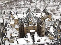 The building is topped by gables at each of its corners.[17][33] The 72nd Street elevation also has a gable above the central entrance. On Central Park West, the central section of the roof is a hip roof. Originally, arched balconies connected the gables.[33] The roof is covered with slate tiles.[32][71] Dormer windows and corbeled brick chimneys protrude from the roof at multiple locations. The dormer windows are arranged in two to four levels and alternately contain either stone or copper frames.[32] There are also turrets, finials, and flagpoles along the roof.[71]