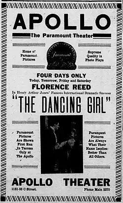 The Dancing Girl is a lost 1915 silent film drama produced by the Famous Players Film Company and distributed by Paramount Pictures. It is based on the 1891 Broadway play of the same name by Henry Arthur Jones. The film was directed by Allan Dwan and starred stage actress Florence Reed in her film debut. Reed's husband, Malcolm Williams, also appears in the film.[1][2]