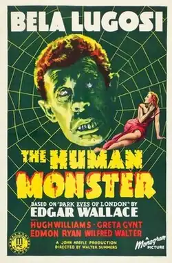 The Dark Eyes of London (U.S. title The Human Monster) is a 1939 British horror film produced by John Argyle and directed by Walter Summers, and starring Béla Lugosi, Hugh Williams, and Greta Gynt.[3] The film is an adaptation of the 1924 novel of the same name by Edgar Wallace. The film is about a scientist named Dr Orloff who commits a series of murders for insurance money, while periodically disguising himself as the blind manager of a charity to further his scheme.