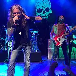 The band toured in 2013, including opening for ZZ Top[7] and joining Aerosmith on their Australian and New Zealand tour.[8] This was followed by the 25-date Uproar Festival in August and September 2013 (with Jane's Addiction and Alice in Chains, among others).[9] These shows were performed by the first full lineup of the band, which consisted of Lowy and Stevens along with drummer Frank Ferrer (also of Guns N' Roses), guitarist Richard Fortus (also of Guns N' Roses, formerly of Thin Lizzy and Psychedelic Furs), bassist Marco Mendoza (Whitesnake/Thin Lizzy), and pianist Dizzy Reed (from Guns N' Roses). Lead singer Stevens performed for a while with casts on his hand and leg as a result of an injury sustained when escaping from a crocodile on a fishing excursion in Australia.[10]
