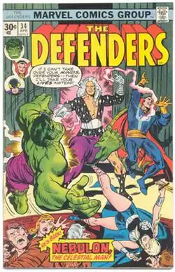 The Defenders first appeared as a feature in Marvel Feature #1 (December 1971).[1] Due to the popularity of their tryout in Marvel Feature, Marvel soon began publishing The Defenders.[2] Writer Steve Englehart has stated that he added the Valkyrie to the Defenders in issue #4 "to provide some texture to the group."[3] Englehart wrote "The Avengers–Defenders War" crossover in The Avengers #116–118 (October–December 1973) and The Defenders #9–11 (October–December 1973).[4] Len Wein briefly wrote the series,[5] and later became the editor for several issues.