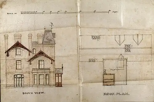 There is a plan of the ground floor of the Dell in the Natural History Museum. This was drawn and annotated by Wallace himself. It may be a draft of the final plans, which were prepared by Wonnacott. The Natural History Museum also has a front view of the house in black ink on waxed linen, coloured with blue and brown inks.[4] This too was possibly drawn by Wallace, although it is unsigned. It shows a grand entrance porch to a house with three levels and a fourth-level attic room. There are three chimneys on the main house and a one-storey wing extending to the right. The house overlooked the Thames and on the ground floor there was a large dining room, a library or drawing room, a breakfast room, a veranda, and a kitchen. It was connected to the local gas supply and collected rainwater, although this supplied only the sink and lavatory.[5]
