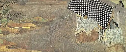 In the diary Murasaki writes of love, hate and loneliness, feelings which make the illustrations, according to Mason, of the "finest extant examples of prose-poetry narrative illustrations from the period".[53] Mason finds the illustration of two young courtiers opening the lattice blinds to enter the women's quarters particularly poignant, because Murasaki tries to hold the lattice shut against their advances. The image shows that the architecture and the men who keep her away from the freedom of the garden to the right.[54]