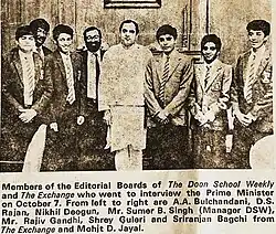Founded by Arthur Foot in 1936, The Doon School Weekly is owned by Indian Public Schools' Society, the governing society of The Doon School. For the first three years of its existence, the newspaper was produced using a cyclostyle, and then moved to a printing press.[7] A number of the Weekly's contributors or editors are today working as authors, journalists, academics or politicians. The list includes Booker Prize-nominee Amitav Ghosh (class of 1972); playwright, poet and novelist Vikram Seth (class of 1970); editors, reporters and columnists for The Economic Times, Forbes, The Wall Street Journal, Hindustan Times, The Washington Post and The New York Times; a number of staff writers for The Times of India newspaper such as Swaminathan Aiyar and veteran editor B G Verghese, including broadcaster Karan Thapar (class of 1971), historian Ramchandra Guha (class of 1973), and politician Mani Shankar Aiyar (class of 1967); and Hindi language writer Vishvjit Singh (class of 1964); Foreign Secretary Uma Shankar Bajpai (class of 1936); Wajahat Habibullah (class of 1963) and Inder Pal Khosla (class of 1954); television-presenter Prannoy Roy and Tejeshwar Singh (class of 1965); and Mahmood Farooqui (class of 1979).[8][9][10] On April 14, 2018, the Weekly published its 2,500th edition, commemorating 82 years of its existence. The edition includes contributions from previous chief-editors such as Karan Thapar, Kanti Bajpai, Rahul Bhagat and Govind Dhar.[11][12]