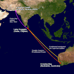 Taking between 27 and 33 hours, with departure timed so that the flight crossed Japanese occupied territory during darkness, the crews would observe the sunrise twice, which led to the service being known as "The Double Sunrise".[15] The flight route flown was along the coast from Crawley to Exmouth then setting out towards Cocos (Keeling) Island or Christmas Island (though neither was actually sighted during the flight1) and onto Galle, a journey of approximately 3,580 nautical miles (6,630 km; 4,120 mi). After the success of the initial flights, it was decided to run a weekly service, with some services flying over Rottnest Island and then taking a direct line to Galle. As part of the Australia-England air route there was a surface component from Galle to Karachi that added considerable time to the service. This was later replaced by the Double Sunrise service, with Karachi to England flown by BOAC.[16] Air crews would change in Galle taking the next plane in either direction minimizing the time taken to complete the journey.[1]1