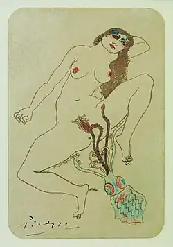 The work influenced later artists such as Félicien Rops, Auguste Rodin, Louis Aucoc, Fernand Khnopff and Pablo Picasso.[15] Picasso drew his own private version in 1903, which was displayed in a 2009 Museu Picasso exhibit titled Secret Images, alongside 26 other drawings and engravings by Picasso, displayed next to Hokusai's original and 16 other Japanese prints, portraying the influence of 19th century Japanese art on Picasso's work.[16] Picasso also later fully painted works that were directly influenced by the woodblock print, such as 1932's Reclining Nude, where the woman in pleasure is also the octopus, capable of pleasuring herself.[17][18]