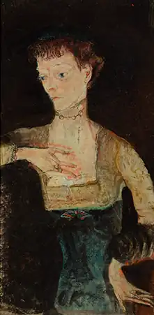 Along with the rest of Kokoschka's early portraits, the Duchess thus marks a departure from the formalized, surface-oriented portraiture then current in fin-de-siècle Vienna, where "representation had adopted a particularly referential position... portraits represented no one; they represent someone as some one else."[15] Instead, "...no one in Kokoschka's early portraits is represented, as the conventions of the times demanded, in a manner befitting social status - not gloriously, charitably, or even realistically."[16] Kokoschka's goal in this was to create "a new kind of psychological portraiture" in which the essence of the subject was isolated and expressed.[17]