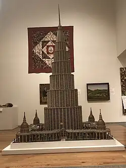 Auriti, an auto-mechanic by trade in Kennett Square, Pennsylvania, worked on his model of a cylindrical tower for over three years. He constructed it on a 1:200 scale. The model stands 11 feet tall, with a horizontal diameter of 7 feet. It is made of wood, plastic, glass, metal, hair combs, and model kit parts, crowned with the television antenna. Auriti went so far as to acquire a patent and exhibit the model both in a storefront and a bank lobby, but his dream of a tower housing the totality of knowledge and dominating the skyline of the US capital was never realized. Following its debut the work was neglected in a warehouse for decades before entering the collection of the American Folk Art Museum.[3]