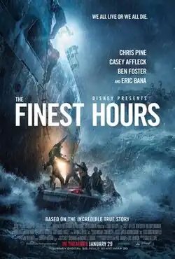 The Finest Hours is a 2016 American action thriller film[7][8] directed by Craig Gillespie and produced by Walt Disney Pictures. The screenplay, written by Eric Johnson, Scott Silver, and Paul Tamasy, is based on The Finest Hours: The True Story of the U.S. Coast Guard's Most Daring Sea Rescue by Michael J. Tougias and Casey Sherman.[9] The film stars Chris Pine, Casey Affleck, Ben Foster, Holliday Grainger, John Ortiz, and Eric Bana, and chronicles the historic 1952 United States Coast Guard rescue of the crew of SS Pendleton, after the ship split apart during a nor'easter off the New England coast.[10][11][12]
