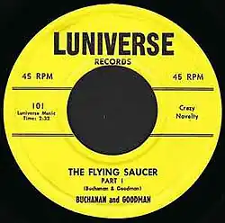 "The Flying Saucer" (also known as "The Flying Saucer Parts 1 & 2") is a novelty record, the first of a series of break-in records released by Bill Buchanan and Dickie Goodman (credited simply as "Buchanan & Goodman"). The song is considered to be an early (perhaps the earliest) example of a mashup, featuring segments of popular songs intertwined with spoken "news" commentary to tell the story of a visit from a flying saucer.