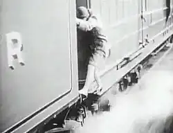 ![]() Pauline Johnson walks along the edge of the locomotive, a genuine stunt in the climax of the film. | |