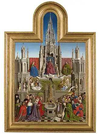 The Fountain of Life closely resembles passages in the 1432 Ghent Altarpiece by Jan and his brother Hubert.[2] Although there is consensus among specialists that it is the product of a workshop, some attribute The Fountain of Life to a youthful Jan, his brother Hubert,[3] or much later, and less likely, Petrus Christus.[4]