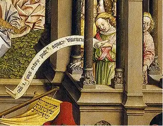 The painting is structured into three levels. The top terrace shows a Deësis of God the Son, the Virgin Mary and St. John the Evangelist. The middle section depicts four groups of angels, while the lower level shows two groups of holy men: Christians, led by a Pope, and princes to the right, and Jews, led by blindfolded high priests, to the left. These two groups represent true believers and non believers in Christ as the messiah respectively.[5] The Fountain of Life is a symbol that refers to baptism and/or the Eucharist. The water that flows from the top to the lower terrace, is intended as a symbol of "the Grace that illuminates the Triumphant Church and blinds the Synagogue".[6]