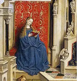 Mary is seated and reading a red book, probably a book of hours. She wears a blue gown, the folds and cloth of which are closely detailed. She has blond hair which is unbraided and falls over her shoulders. In contrast to her depiction in the Ghent Altarpiece, here her dress is plain, lacks any embroidery or gilded lining, while her book is not girdled. John is dressed in a green robe, has blond hair and sits writing in a holy book.