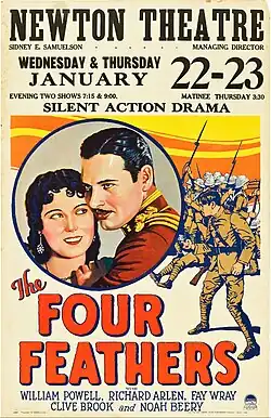 The Four Feathers is a 1929 American synchronized sound war film directed by Merian C. Cooper and starring William Powell, Richard Arlen, Clive Brook and Fay Wray.[1] This was the third of numerous film versions of the 1902 novel The Four Feathers written by A. E. W. Mason. While the film has no audible dialog, it was released with a synchronized musical score with sound effects using both the sound-on-disc and sound-on-film process. The 1929 version of The Four Feathers premiered at the Criterion Theatre in New York City on June 12, 1929.[2]