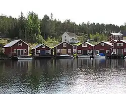 At the outset, the families of the fishermen resided in simple log houses featuring a single room and a fireplace built from natural stone. Furnishings were limited to essential items like beds, tables, and chairs. After each fishing trip, the fishermen would haul their boats ashore. As time progressed, houses became more elaborate, boasting multiple rooms and built from wooden boards. Nevertheless, their interiors remained rather modest. In a typical fishing village during the early 19th century, sheds encircled a bay, with boats resting on the adjacent beach and dwellings situated above them.[18] Boathouses designed for shelter from inclement weather were only erected towards the end of the 19th century, with some of the older sheds being converted for this purpose. These sheds, oriented with their gables facing the water, served as storage spaces for vats, barrels, and tools. On the water-facing side, they featured docks for the loading and unloading of boats. Originally, these dwellings and sheds were unpainted; it was not until the early 20th century that they adopted the distinctive Falun red color.[19]