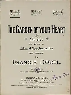 "The Garden of Your Heart" is a song composed by Francis Dorel and Edward Teschemacher. The first and only known recording was by American tenor Charles Harrison in 1916 for Columbia Records. This song is mentioned in the ragged trousered philanthropist, a book from 1913, being played on a Polyphone, a very early type of Jukebox