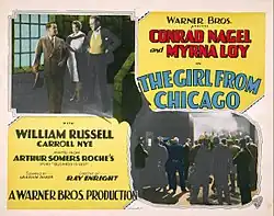 The Girl from Chicago is a lost[1] 1927 American synchronized sound criminal romantic drama film directed by Ray Enright and starring Myrna Loy and Conrad Nagel. While the film has no audible dialog, it was released with a synchronized musical score with sound effects using the Vitaphone sound-on-disc process. The film was produced and distributed by the Warner Bros. and is based upon a short story by Arthur Somers Roche that appeared in the June 1923 Redbook.[2]