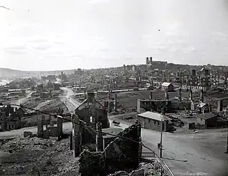When morning broke the thick clouds of smoke still ascended from the burning ruins, and it was hours before it had cleared sufficiently to admit a view of the track of the desolating scourge. A walk through the deserted streets demonstrated that the ruin was even more complete than seemed possible at first. Of the whole easterly section, scarcely a building remained… of the costly and imposing structures and public buildings which were the pride and glory of the people, scarcely a vestige remained; and St. John's lay in the morning as a city despoiled of her beauty, her choicest ornaments, presenting a picture of utter desolation and woe.[4]: 7