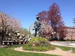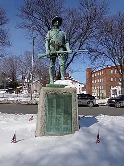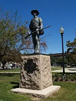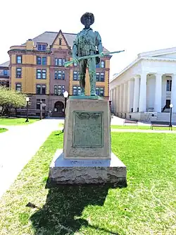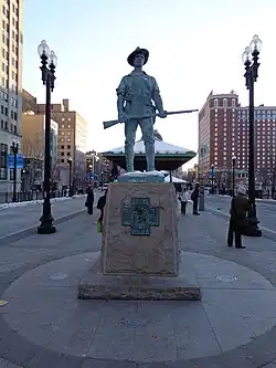 The original statue was unveiled at the University of Minnesota on Memorial Day, 1906.[4] The statue stands in front of the armory at 15 Church Street. Also known as the Student Soldier Memorial, it is a monument to the 218 University of Minnesota students who served in the Spanish–American War.[5] The statue is 9 feet (2.7 m) tall and stands on a 6-foot (1.8 m) granite base, depicting a soldier clad in a period uniform with a campaign hat and a Krag–Jørgensen rifle. Today this statue, now missing the muzzle of the rifle,[6] is popularly known as Iron Mike.[5]