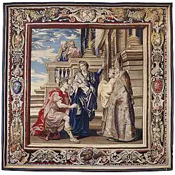 The History of Constantine is a series of tapestries designed by the Flemish artist Peter Paul Rubens and Italian artist Pietro da Cortona depicting the life of Constantine I, the first Christian Roman emperor. In 1622, Rubens painted the first twelve oil sketches that were used as guides, and the tapestries themselves were woven in the workshop of Marc Comans and François de la Planche in the Faubourg Saint-Marcel in Paris by 1625,[1] transforming each small sketch (perhaps two feet per side) into a sumptuous creation of wool, silk, and gold and silver threads that could easily fill a wall.[2] An additional five designs were painted by Cortona in 1630 and woven in the atelier of Cardinal Francesco Barberini in Rome over the next decade.[3]