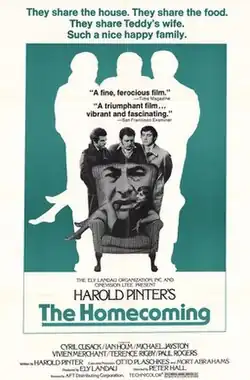 The Homecoming is a 1973 British-American drama film directed by Peter Hall based on the play of the same name by Harold Pinter. The film was produced by Ely Landau for the American Film Theatre, which presented thirteen film adaptations of plays in the United States from 1973 to 1975.[1] The film was screened at the 1974 Cannes Film Festival, but was not entered into the main competition.[2]