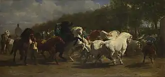 The Horse Fair is an oil-on-canvas painting by French artist Rosa Bonheur, begun in 1852 and first exhibited at the Paris Salon in 1853. Bonheur added some finishing touches in 1855. The large work measures 96.25 in × 199.5 in (244.5 cm × 506.7 cm).[1]