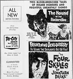 The Hound of the Baskervilles is a 1959 British Gothic mystery film directed by Terence Fisher and produced by Hammer Film Productions. It is based on the 1902 novel of the same title by Sir Arthur Conan Doyle. It stars Peter Cushing as Sherlock Holmes, Christopher Lee as Sir Henry Baskerville and André Morell as Doctor Watson. It is the first film adaptation of the novel to be filmed in colour. Roy Ashton did Makeup, Syd Pearson did Special Effects, Bernard Robinson was Production Designer and Don Mingaye was Art Director. John Peverall and Tom Walls were Assistant Directors. Production began Sept. 8, 1958, but Marla Landi was only added to the cast on Sept. 29th, and the film was completed on Oct. 31st. It was trade shown at the Hammer Theatre on March 20, 1959 and premiered at the Pavilion on March 28th. It opened in the UK on May 4th, 1959, and in the United States in July.[5]