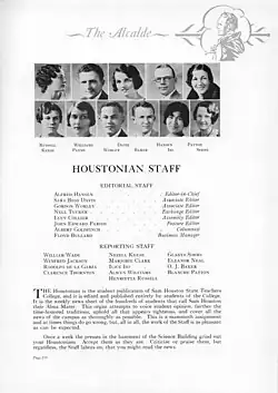 The editor-in-chief of The Houstonian in 2013 was Stephen Green; he simultaneously worked as a staff reporter for The Huntsville Item.[12][13] The editor-in-chief of The Houstonian in 2014-2015 is Jay R. Jordan, succeeding previous EIC Connor Hyde.[14]
